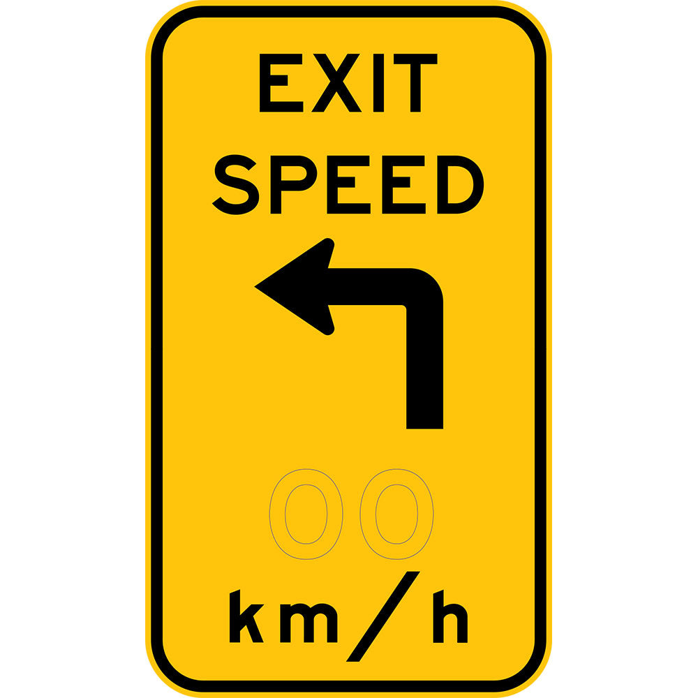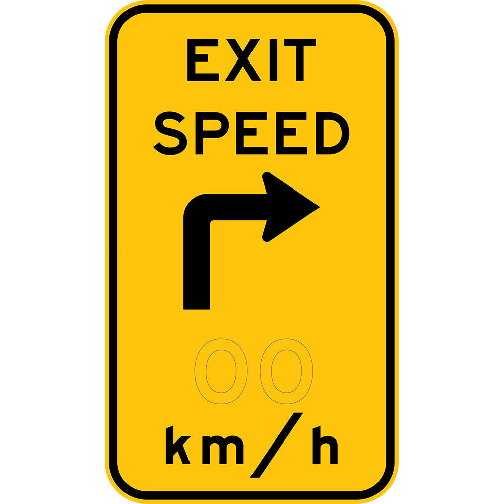 W1-9-3 Exit Speed x km/hr with turn symbol (L or R)