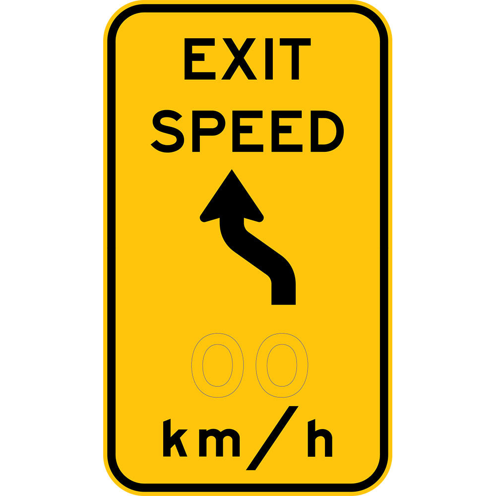 W1-9-4 Exit Speed x km/hr with reverse turn symbol (L or R)