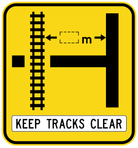 W7-12-3n(L) - Rail Crossing On Side Road (symbolic - 'T' junction Left) Keep Tracks Clear