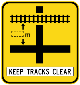W7-13-2n - Rail Crossing On Side Road (symbolic - 'Cross' junction) Keep Tracks Clear